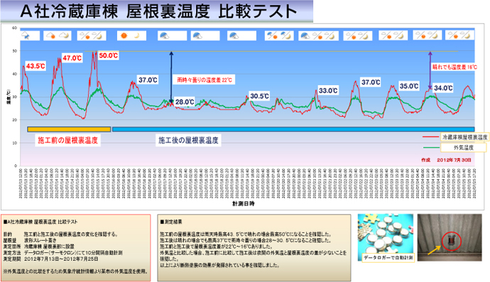 屋根の表面・裏面温度を測定した結果、鉄板で20度、スレートでは15度前後の温度低下が確認されました。